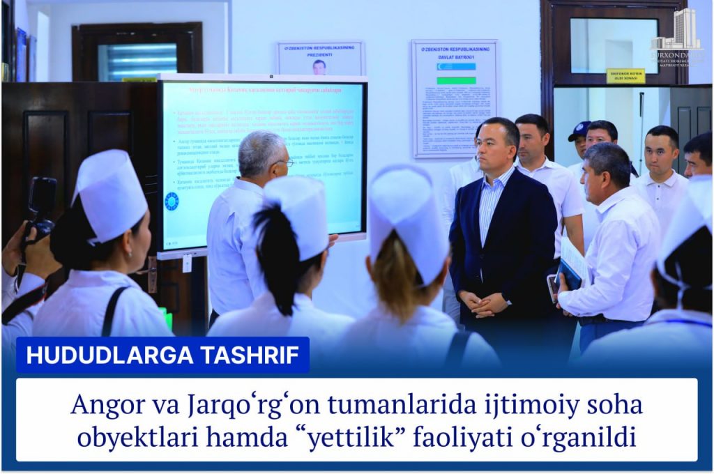 Surxondaryo viloyati hokimi Ulug‘bek Qosimov Angor va Jarqo‘rg‘on tumanlarida bo‘lib, maktab va oilaviy poliklinikalar faoliyati, aholiga ko‘rsatilayotgan tibbiy xizmat sifati bilan tanishdi. Mahallalarda “yettilik”ning amalga oshirilayotgan ishlar yuzasidan axboroti tinglandi.