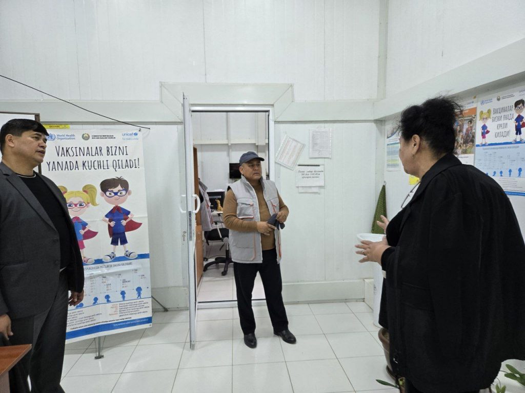 Республика Сан.эпид қўмитани 2024 йил 14-октябрдаги 273-сонли буйруғига асосан 23-24-октябр кунлари Сурхондарё вилоятида бўлиб, ташриф давомида Вилоят сан.эпид. бошқармасининг бакпрепаратларни сақлаш омборхонасида ҳамда Термиз шаҳар ва Термиз туман ДПМ ларида Ўзбекистон Республикаси ССВнинг 2015 йил 27-январдаги 36-сонли буйруғи, №0239-07/4-сонли санитария қоида ва меъёрлари ижросида қизамиқ касаллигини олдини олишдаги профилактик ва эпидемияга қарши чора-тадбирларни ҳамда вакциналарни самарали бошқаруви, профилактик эмлашларни соғлиқни сақлаш тизими амалиётда олиб борилаётган тадбирлар холати ўрганилиб, амалий-услубий ёрдам кўрсатилди ҳамда келгусида бажарилиши лозим бўлган ишлар юзасидан керакли чора-тадбирлар белгилаб берилди.