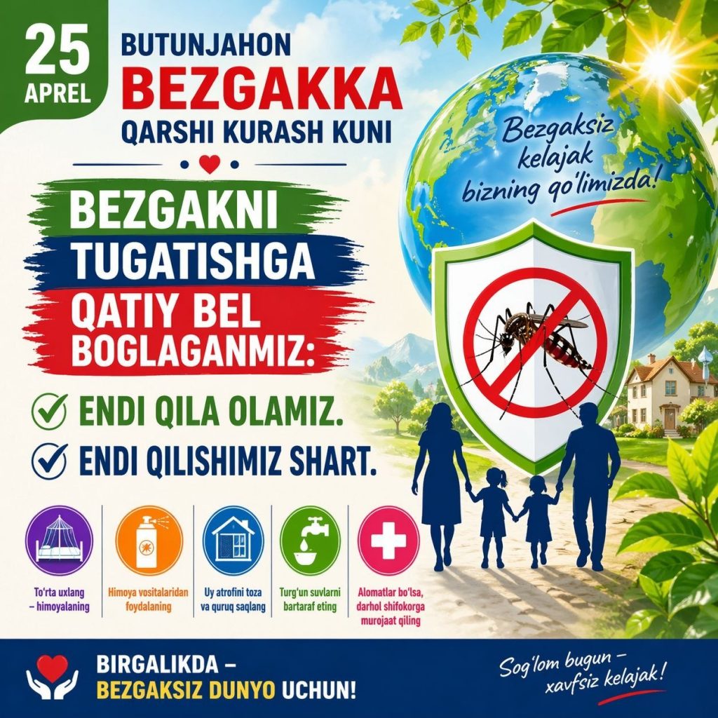Har yili 25 aprel sanasiga bag‘ishlab bizning mamlakatimizda ham barcha targ‘ibot vositalaridan foydalangan holda bezgakni oldini olish borasida aholining bilimlarini oshirish bo‘yicha tadbirlar faol o‘tkaziladi.